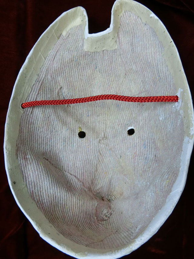 そこで、長時間着用したい方のためにお面の内側に布張りをしたバージョンを用意しました。この布は綿をベースに麻、羊毛を織り交ぜたもので、この用途のために作られたものです。布張りにより表面の湿気を布が吸い取り、お面部分に直接ダメージが行かないようになり、また蒸れにくくなります。
