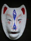 この狐、高松出身です。香川県伝統工芸士として認定されている、乃村七重入魂の作。まず目を引くのは鮮やかな青の塗料と、そこに散らされた金箔。顎が動くのを含め、他にはない狐面になっています。