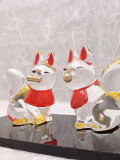 京都の和雑貨メーカー、リュウコドウは動物をモチーフとした小物や置物の数々を製作しており、その中の一つが狐グッズでございます。このクリスタル稲荷神セットは2体の狐人形がセットになっていて台座付きでございます。ガラス製で透明な狐の下部は金色に塗られていて、それが光を反射して透明な狐を金色に彩るのでございます。