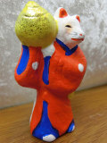 東京の今戸(浅草の近く)で戦国時代の末期頃から作り始められた素焼の陶磁器を総称して今戸焼きといいます。かつては関東一円で焼き物のブランドとして有名でした。そんな今戸焼きで作られた人形の中に招き猫の元祖もあり、そして狐の人形も存在していました。今戸人形は素焼きで壊れやすく、子供の玩具として与えるとその壊れやすさが逆に癇癪を起こさない辛抱強さにつながるとして歓迎されました。しかし明治維新以降、ブリキやセルロイド等の丈夫な素材の人形が登場すると、その壊れやすさ故に隆盛は下火となります。そうして昭和19年、最後の今戸人形師である尾張屋の七代目、金澤春吉翁の他界により今戸狐人形の命脈も一度は途絶えてしまいました。そうした今戸人形の狐達を、現代に再現しようと活動されているのがこの人形の作者である吉田義和氏です。