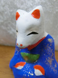 東京の今戸(浅草の近く)で戦国時代の末期頃から作り始められた素焼の陶磁器を総称して今戸焼きといいます。かつては関東一円で焼き物のブランドとして有名でした。そんな今戸焼きで作られた人形の中に招き猫の元祖もあり、そして狐の人形も存在していました。今戸人形は素焼きで壊れやすく、子供の玩具として与えるとその壊れやすさが逆に癇癪を起こさない辛抱強さにつながるとして歓迎されました。しかし明治維新以降、ブリキやセルロイド等の丈夫な素材の人形が登場すると、その壊れやすさ故に隆盛は下火となります。そうして昭和19年、最後の今戸人形師である尾張屋の七代目、金澤春吉翁の他界により今戸狐人形の命脈も一度は途絶えてしまいました。そうした今戸人形の狐達を、現代に再現しようと活動されているのがこの人形の作者である吉田義和氏です。